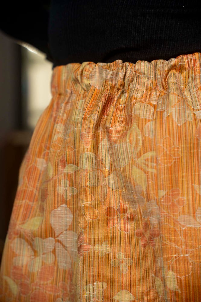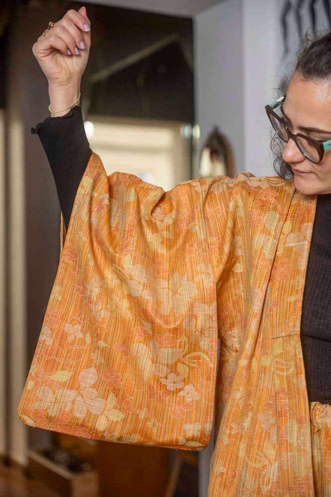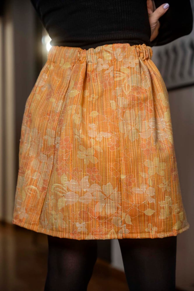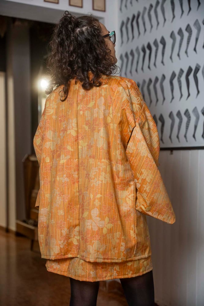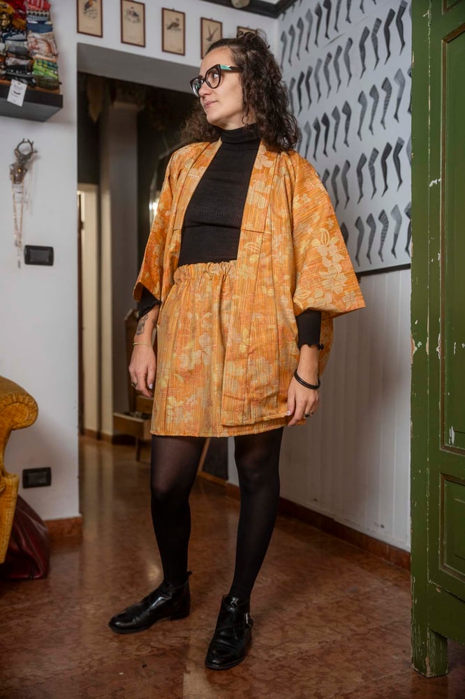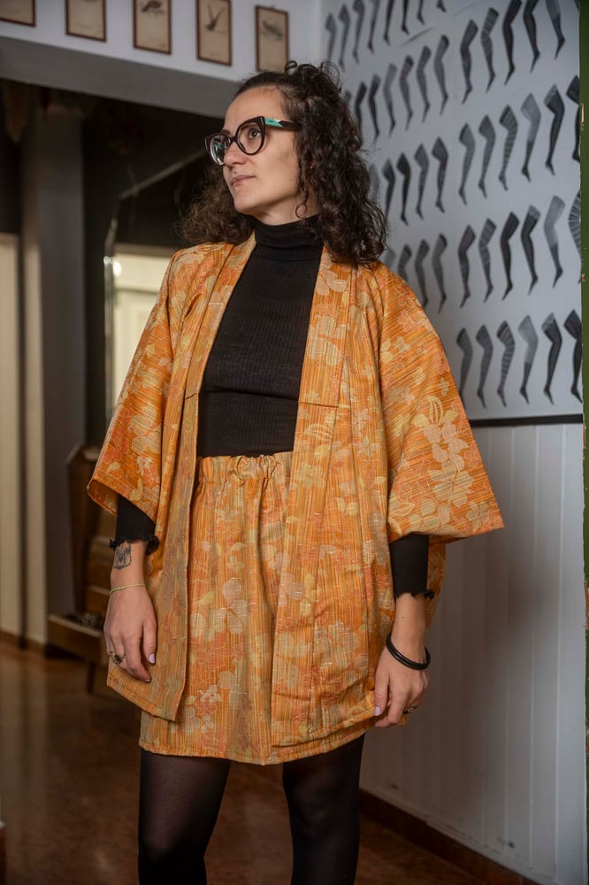 Ogni kimono è stato sapientemente modificato per trasformarsi in un capo unico e versatile: una minigonna elegante e un kimono corto perfetto da indossare come soprabito.